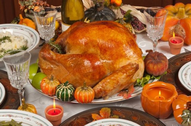 На праздничном столе в этот день обязательно присутствуют различные традиционные блюда. Одним из самых популярных блюд является индейка, которая запекается в духовке с различными специями и начинкой из клюквы. Также на столе не обойдется без картофельного пюре, клюквенного соуса, кукурузного хлеба, фаршированных орехами и клюквой яблок, печеного картофеля и тыквенного пирога.